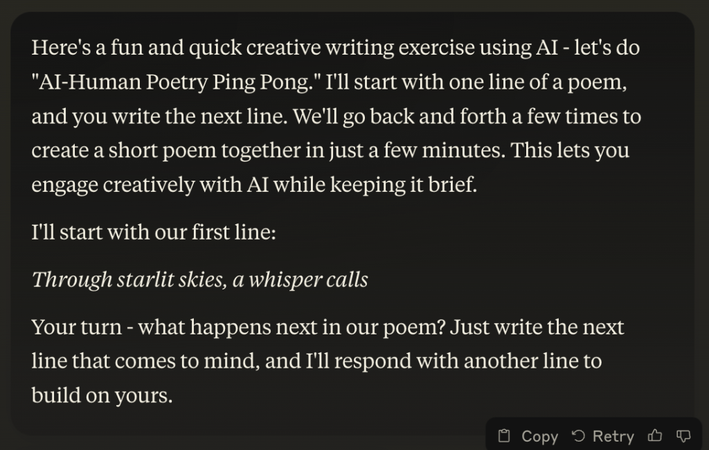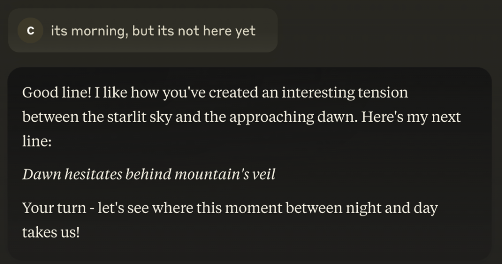 Interesting. Both ChatGPT and Claude offered a back and forth creative writing activity in this and my last LLM sessions.