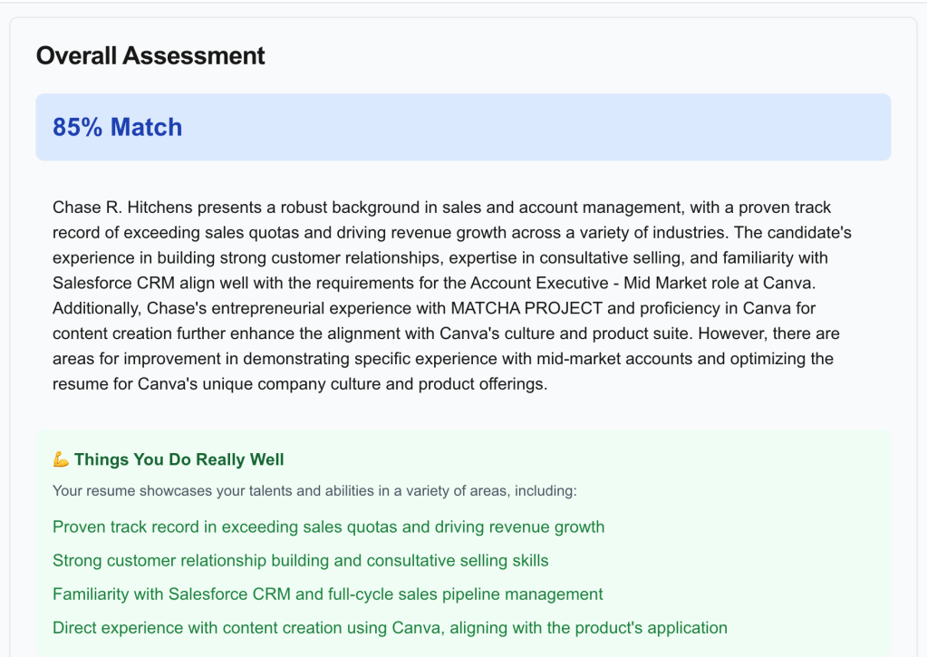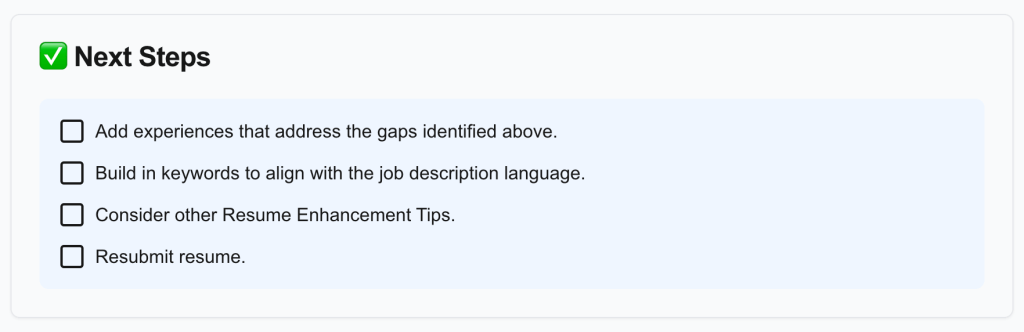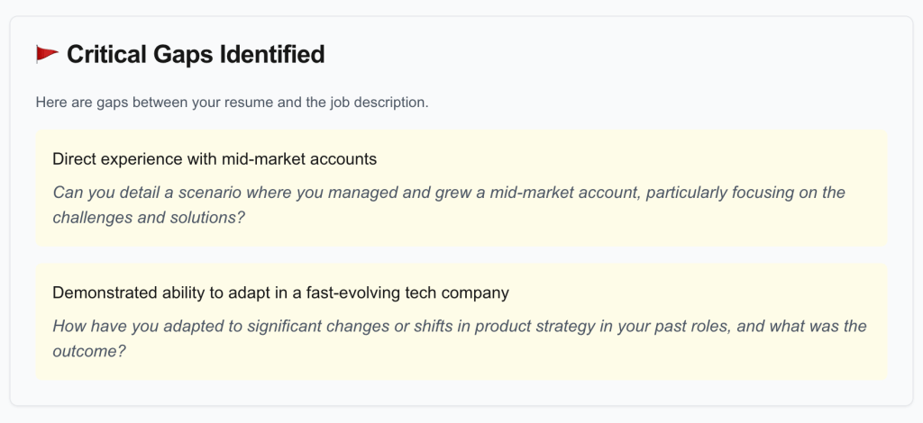 Next, it identifies any gaps it spots between the job description and resume. It goes on to offer a though provoking question about if there is any overlap with things you have done in your past or other ideas to address the gap.