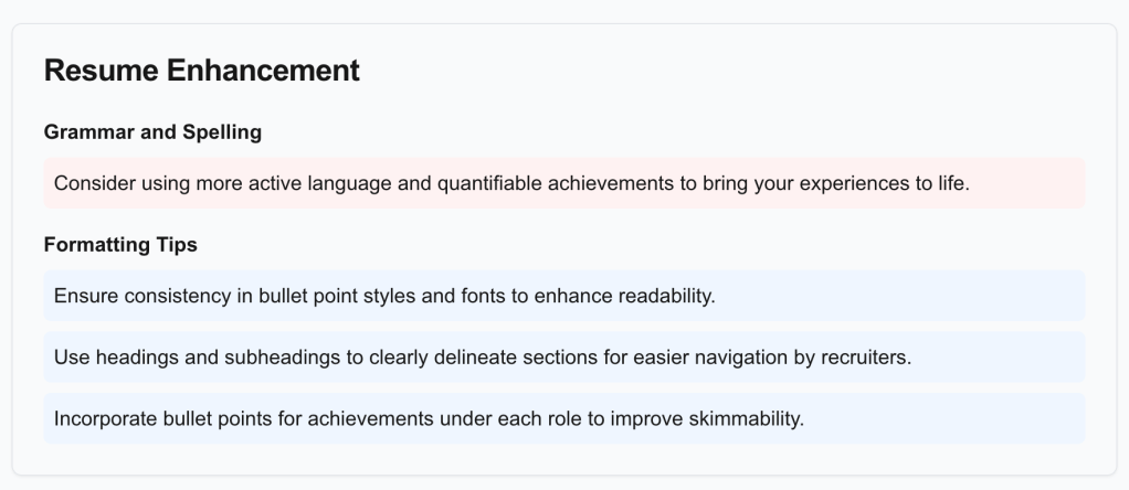 Next, the tool looks at spelling and grammar. And it offers a few tips or ideas for effective formatting.