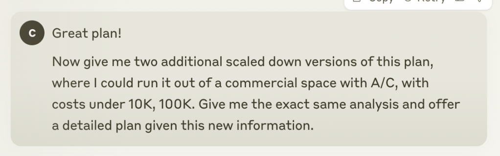 Claude gave me a very sound business plan & analysis. In it, Claude was operating under the idea that scale was irrelevant and it opted to build out a plan that would cost $1 million to build and execute.