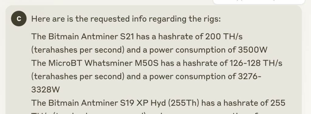 Claude then starts to create the updated business plan, but alerts me that I am missing key specs that are essential to the analysis. Specifically, I was missing their power consumption and hash rates.