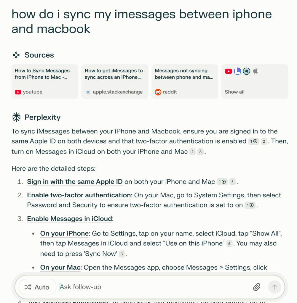 Today, I needed help getting my iMessages to sync across devices:, so i turned to Perplexity.