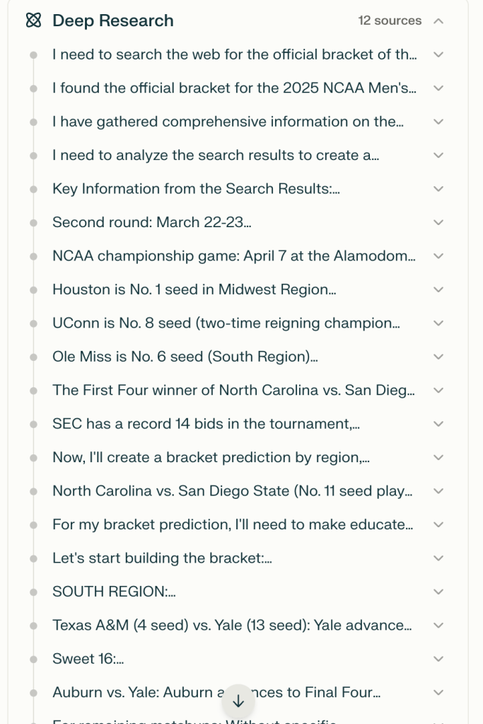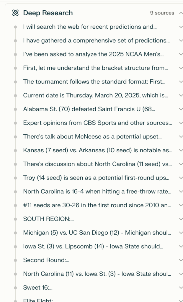 Oh, and one other thing. I uploaded a .pdf copy of the 2025 bracket as a reference point, and I opted for Deep Research using R1, once again.