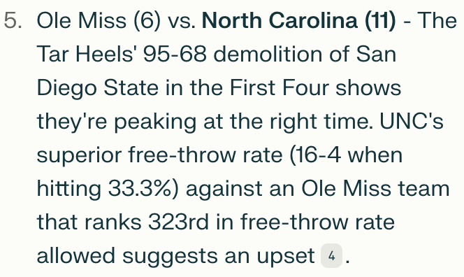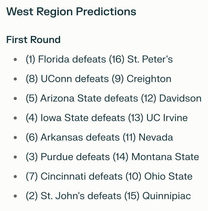 This time, I would dial in my prompt a bit more and attempt to guide the model to seek out and dig deeply into data, and would use this data to decide which teams would win each respective game.