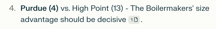 I knew Purdue was a 4 seed, so this was an immediate red flag. Further, Montana State was not High Point.