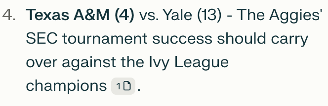 This seemed totally reasonable. I was a little disappointed there was no real explanation or reasoning for any of the picks, aside from UC San Diego upsetting Michigan “their stellar 30-4 mark gives them the edge.”