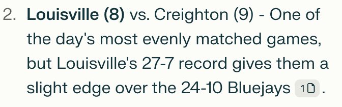 Now this result seemed reasonable, I knew (8) Louisville would play (9) Creighton in the first game today, so that checked out.