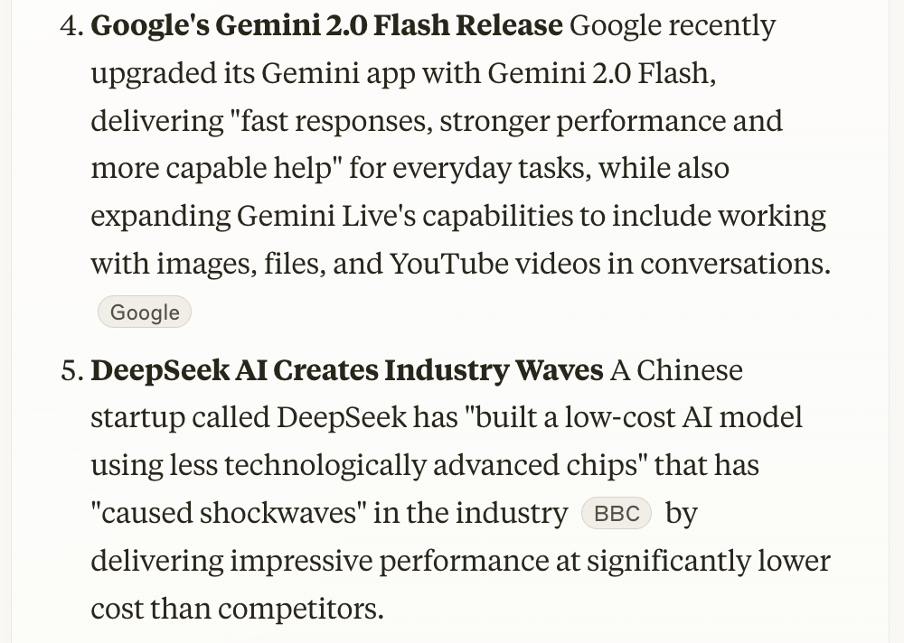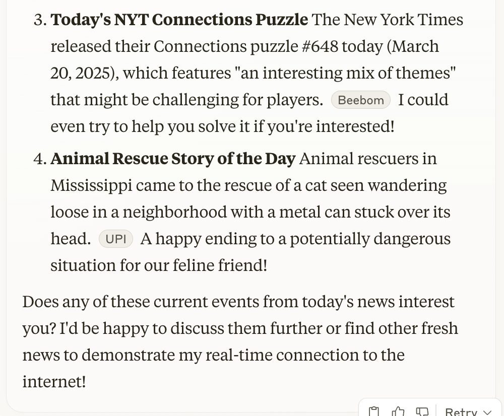 Claude came back to me with a list of 3 “interesting” current events and a NYT word puzzle from that day.
