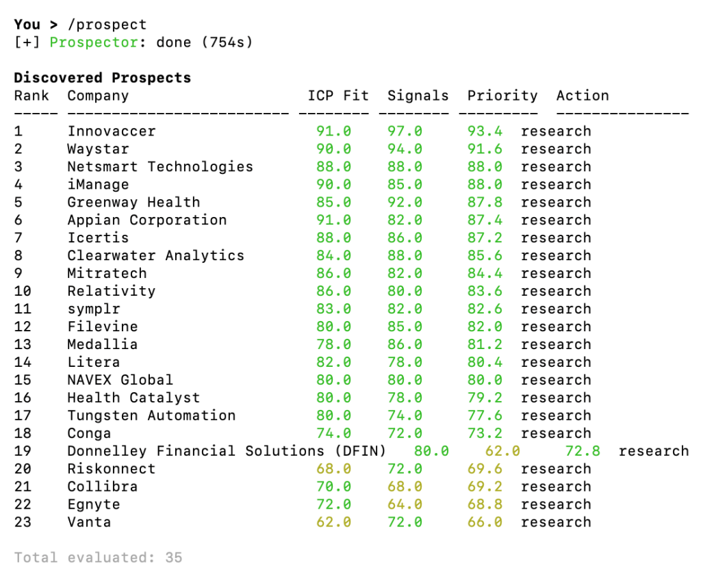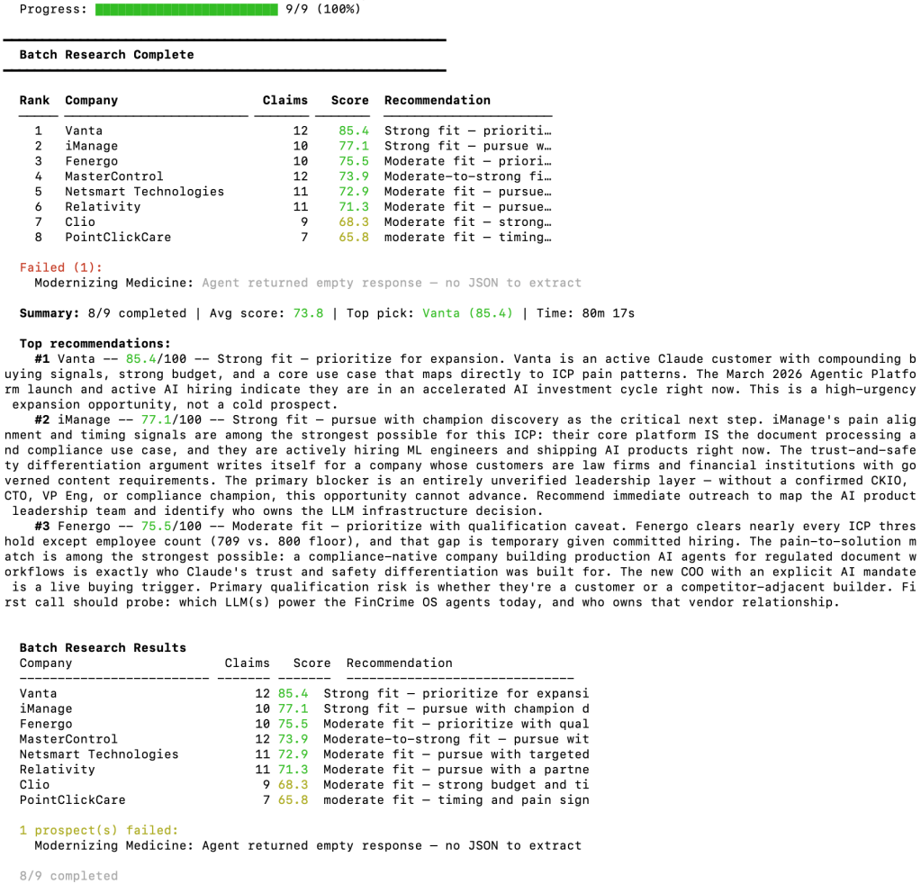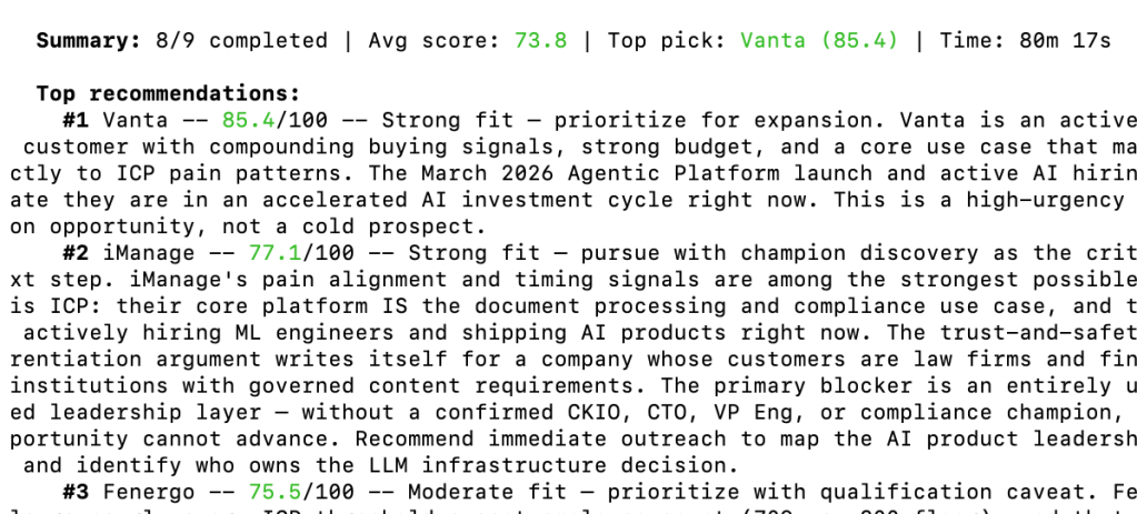 Last week, before bed, I typed /batch-research into my computer, hit ‘return’, and went to bed. When I woke up, I had a list of 8 prospects, scored and ranked based on a readiness-to-buy analysis, with recommended next steps for each.