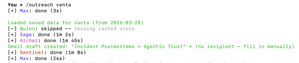 Typing /outreach Vanta into my computer kicks off a process that pulls saved context (each prospect has its own .md record in my files) and feeds it to the next agent, Sage. Sage then strategizes the proper framing and context to engage the specific prospect.