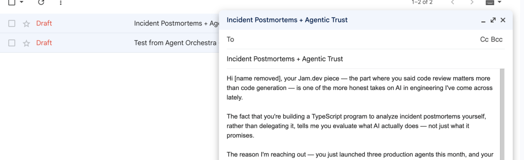 The following words appeared on my screen: “Gmail draft created: “Incident Postmortems + Agentic Trust” → (no recipient — fill in manually).”
